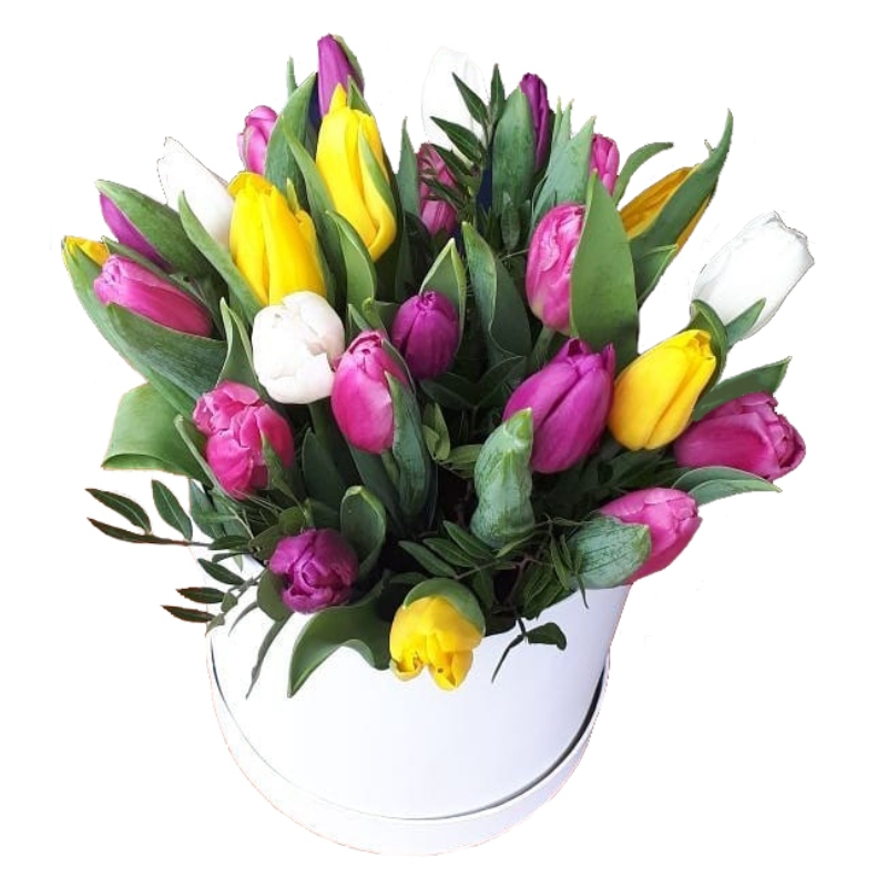 Букет состоит из MIX из 25 тюльпанов, коробка, оазис.
